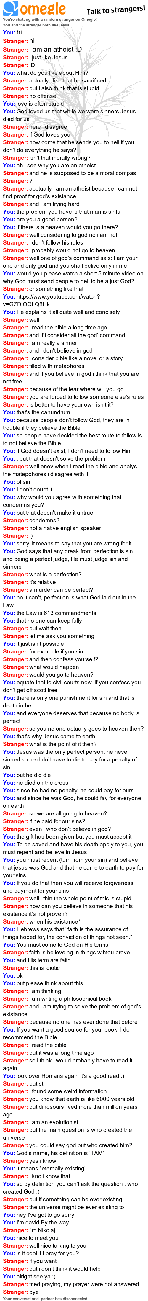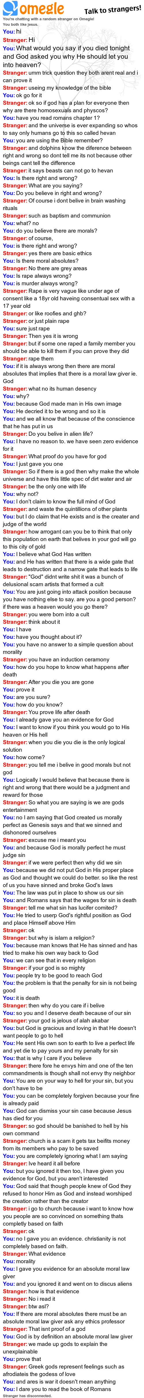 Here is a discussion I had with an atheist that did not go very well. Instead of going straight into the Gospel, I deviated into evidence for God. The belief in absolute morality is a strong evidence for the existance of God. If something is always wrong then there are moal absolutes so there must be an absolute moral law giver. The problem is that even if you do provide evidence for God, that will not make someone believe in Him.